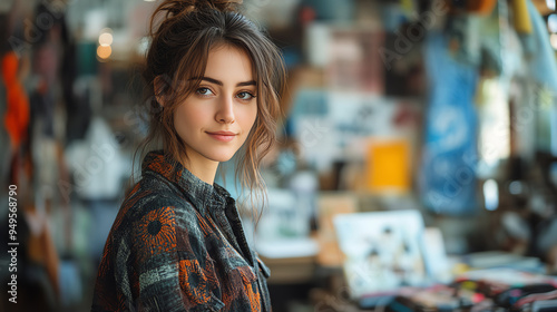 A young woman smiles confidently in an artistic studio filled with vibrant colors and creative inspiration.