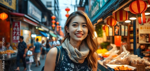 woman, smiling, happy, asian, street, market, lantern, red, chinese, food, stall, shop, seller, travel, tour tourism, city, urban, culture, traditional, bright, colourful, light, people, crowd, walking, tied-up, shopping, clothes, foulard, backpack, earring, daytime, background, blur, bokeh, sharpened, portrait, casual attire, fashion, young, adult, image, brightly, she, walk, bustling