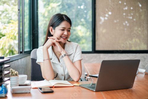 woman, laptop, office, modern, smile, work, professional, business, technology, desk, window, greenery, natural, light, casual attire, workspace, productivity, happy, indoor, job, career, digital, communication, freelance, remote, employee, corporate, lifestyle, young, female, entrepreneur, meeting, creative, sharpened, concentration, success, innovation, contemporary
