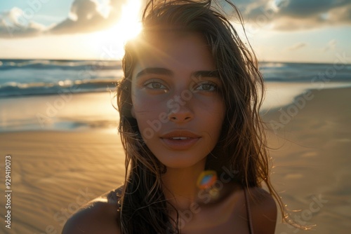 A young woman stands at the edge of a sandy beach, looking out at the ocean