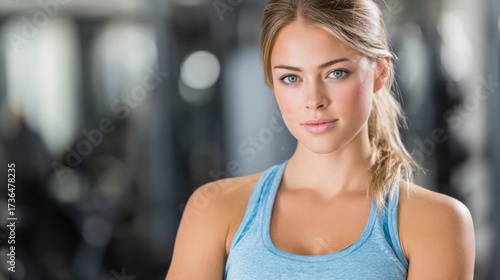 A young woman stands in a gym wearing a blue tank top. She looks relaxed and prepared for her workout with fitness equipment visible in the background.