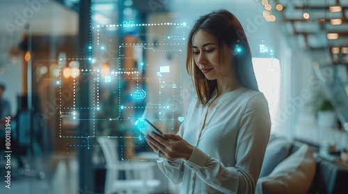 A young woman uses her smartphone amidst glowing network connections symbolizing digital interaction.