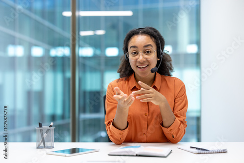 customer service, support, call center, communication, online, video, conference, meeting, business, remote, person, businesswoman, black woman, hispanic, telecom, headset, office, workspace, desk, woman, female, young, adult, smile, happy, cheerful, confident, professional, employee, representative, speaking, talking, gesture, interaction, virtual, tablet, notebook, goggles, brunette, modern, technology, screen, contact, service, assistance, help, consultation, window, corporate