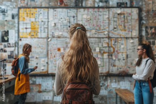A young woman with a backpack studies a detailed transportation map in a modern urban setting, planning her route