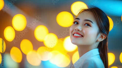 A young woman with a captivating smile looking upward, surrounded by soft, golden bokeh lights.