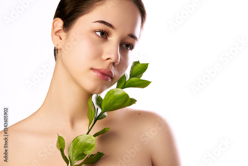 woman, beauty, portrait, nature, skincare, fresh, natural, elegance, wellness, green, leaf, eco, sustainability, glow, purity, harmony, softness, minimalism, serene, healthy, youthful, botanical, organic, peaceful, radiant, environmentally friendly