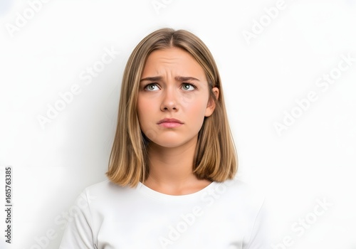 white, blonde hair, white shirt, white background, young, expression, female, thought, woman, clothing, thoughtful