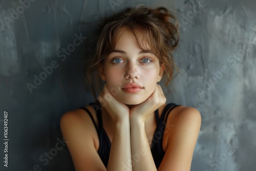 A young woman with blue eyes and brown hair rests her chin on her hands, gazing thoughtfully at the camera against a textured gray background.