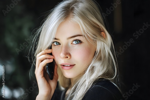 a young woman, with captivating blue eyes, engaged in a phone conversation, exudes an air of elegance and sophistication