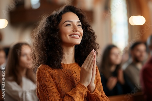 woman, church, prayer, faith, religion, hope, spirituality, worship, belief, peace, serenity, praying, hand, clasped, orange, sweater, curly, hair, young, female, adult, inside, building, religious, devotion, gratitude, blessed, spirit, soul, god, divine, calm, peaceful, tranquil, contentment, smile, happy, joy, positive, optimistic, light, bright, atmosphere, people, congregation, service, belief
