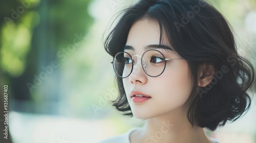 A young woman with dark hair and round glasses looks to the side with a thoughtful expression.