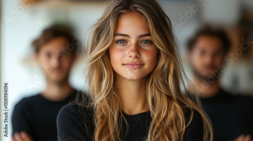 A young woman with freckles standing in front of a group of people