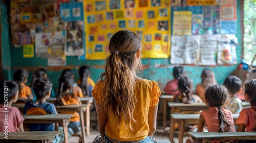 A young woman with her back to the camera is teaching a classroom of children. There are colorful posters on the wall behind the class.