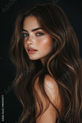 A young woman with long, flowing brown hair. She is looking directly at the camera with a soft, feminine expression. Her skin is smooth and clear, and her lips are slightly parted.