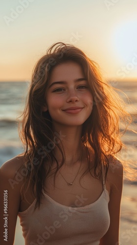 smiling, woman, sunset, beach, portrait, young, happiness, peaceful, wavy hair, golden hour, natural light, serene, female, beauty, summer, nature, relaxed, sunlight, casual attire, joyful, sand, ocean, sea, carefree, cheerful, glow, fashion, travel, vacation, lifestyle, radiant, inspiration, closeup, horizon, youth, candid, calm, fun, smiling face, soft light