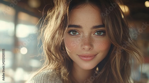 woman, freckle, green eye, smile, cosy, cafes, warm light, afternoon, natural beauty, indoor, relaxation, ambience, happiness, casual attire, greeting, youthful, charming, beauty, lifestyle, candid, closeup, portrait, friendliness, joy, calmness, hot drink, friends, atmosphere, urban, social, feminine, aesthetic, personal, leisure, inviting, warmth, serene, enjoyment, connection, cheerful, living space, intimate, contemporary, expression, captivating