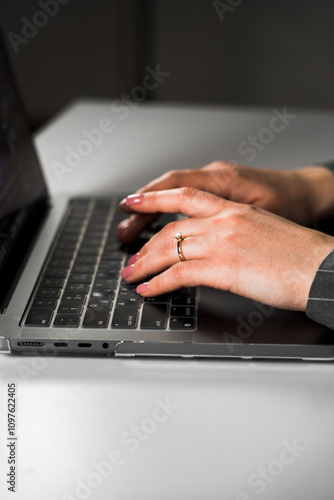 A young woman with red hair works at a laptop. A female student studies at a laptop. The concept of remote work. Portrait of an office worker