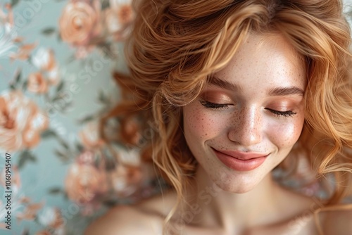 A young woman with vibrant curly hair smiles softly, her eyes closed in contentment. She is surrounded by a floral patterned backdrop that enhances her serene expression