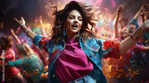 A young woman with wavy hair enjoying a lively party with confetti and friends dancing in the background.