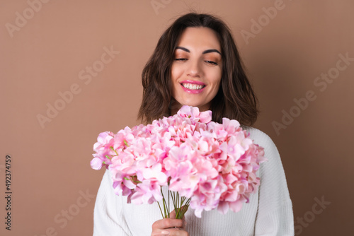 A young woman with wavy voluminous hair on a beige background with bright pink lipstick lip gloss in a white sweater holds a bouquet of pink flowers