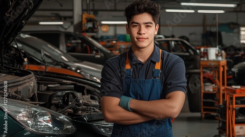A young worker wearing blue overalls, focused on auto body repair in a busy garage.