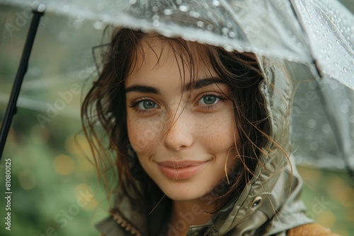 young adult, smile, rain, raindrop, youthful, allure, charme, nature, beauty, fresh, contemporary, greenery, captivating, engaging, portrait, closeup, water, wet, fashionable, rainwear, stylish, skin, eye, make-up, coiffure, photo, lifestyle, season, weather, grace, contentment, relaxation, freshness, waterproof, flower