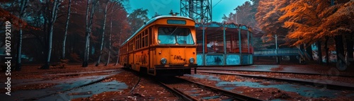Abandoned amusement park with overgrown rides, eerie and nostalgic, Urban, Muted tones, Photograph, Forgotten fun