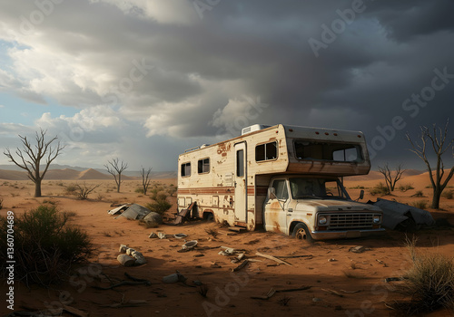 Abandoned Camper Van in Desert Landscape with Dramatic Stormy Sky