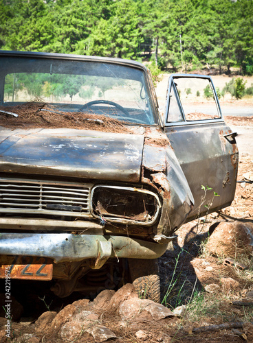 car, abandoned, old, rust-eaten, vintage car, retro, old-fashioned, transportation, wreck, metal, forest, pine, nature, summer, day