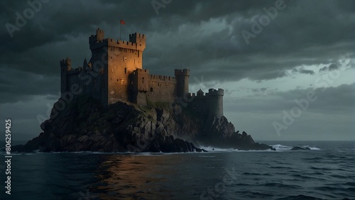 Abandoned castle in the heart of the rock by the raging sea. A decrepit castle, perched on a cliff overlooking a churning sea.