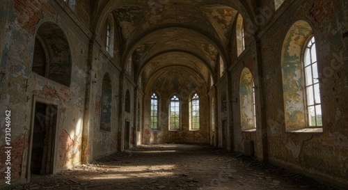 Abandoned Church Interior with Peeling Walls and Arched Windows