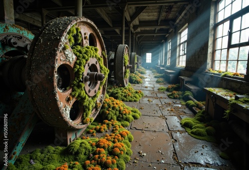 abandoned, factory, machinery, moss, sunlight, green, flower, industrial, nature, atmosphere, vibrant, scene, eerie, colourful, window, dust, environment, decay, urban, exploration, overgrown, plant, shadow, beam, interior, landscape, texture, growth, forgotten, history, rustic, beauty, serene, tranquil, old, equipment, light, pattern, colours, stillness, quiet