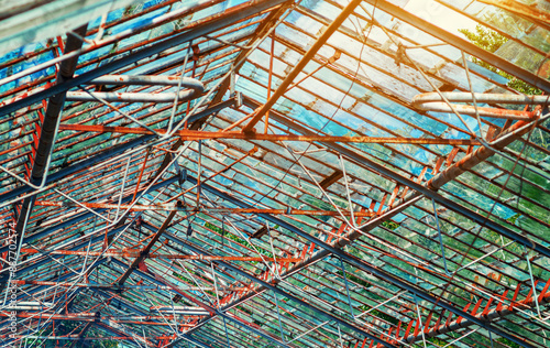 Abandoned greenhouse. The roof of an old greenhouse with rusted metal ceilings and broken windows.
