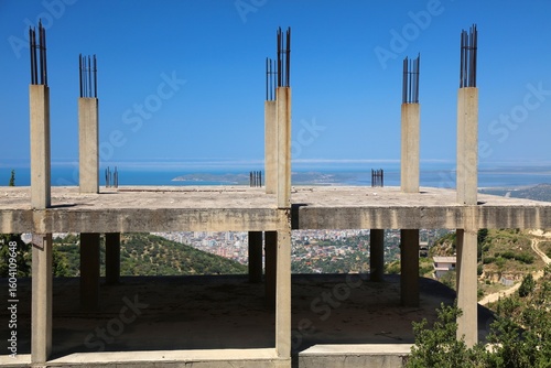 city, town, architecture, albania, albanian, building, view, urban, city landscape, sunny, weather, day, daytime, summer, sea, adriatic, construction, hotel, apartment building, abandoned, interrupted, unfinished, incomplete, concrete, reinforced
