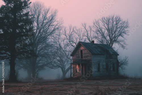house, abandoned, fog, tree, twilight, evening, nature, rural, architecture, old, halloween, background, horror, scarey, skittish, trick, treat, exterior, weathered, empty, landscape, countryside, eerie, building, wooden, home, isolation, creepy, mist, gloomy, quiet, dark, remote, silent, structure, decay, outdoors, vintage, rustic, atmospheric, deserted, lonely, desolate, tranquil, fading, autumn, nostalgia, solitude