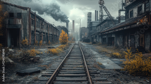 Abandoned Industrial Area With Overgrown Tracks and Smokestacks in a Gray, Desolate Landscape