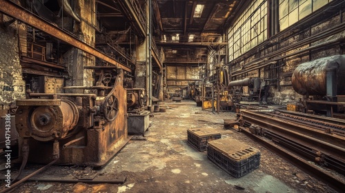 abandoned, building, brick, factory, rust-eaten, machinery, industrial, old, interior, window, metal, beam, pipe, gear, wheel, floor, dust, grime, concrete, light, shadow, decay, weathered, forgotten, derelict, remnant, structure, construction, history, time, past, empty, space, silent, haunting, atmosphere, mood, texture, detail, composition, photo