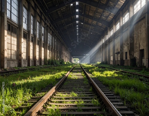 Abandoned Industrial Complex with Old Railway Tracks and Rusty Buildings