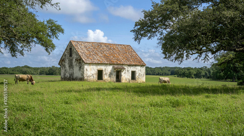 barn, abandoned, rustic, countryside, nature, pasture, cattle, green, old, building, landscape, sky, cloud, serene, rural, field, farming, environment, agriculture, sunlight, vintage, architecture, scenery, secluded, calmness, outdoors, grass, heritage, south, weathered, historical, peaceful, farm animal, area, barnyard, summer, scenic, farmland, natural, sky blue, restoration, tree, wildlife, sunny, horizon, ground, farm