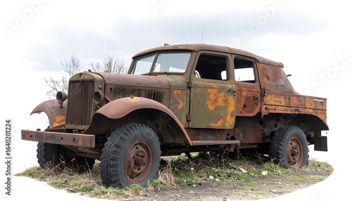 rust, abandoned, truck, military, weathered, vehicle, old, rust-eaten, decayed, damaged, metal, terrain, wheel, ground, exterior, isolated, dirt, landscape, worn, field, rusted