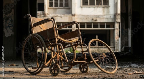 wheelchair, abandoned, rust-eaten, broken, decay, old, dilapidated, vintage, antique, worn, damaged, neglected, forgotten, urban, decaying, weathered, deteriorated, past, history, memory, nostalgia, ruin, structure, building, exterior, facades, window, architecture, abandonment, distress, despair, sorrowful, loneliness, isolation, tragedy, suffering, disability, mobility, assistance, care, medicals, health, transport, equipment, object, scene, photograph