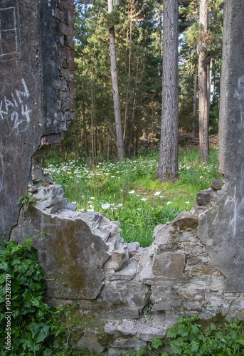 Abandoned stone house ruins overgrown with greenery and white calla lilies in tranquil Australian forest, nature power