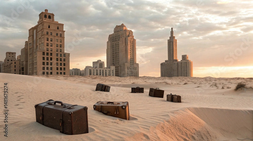 Abandoned suitcases buried in sand among empty cityscape, surreal travel abandonment concept, lost journeys, post-apocalyptic future metaphor