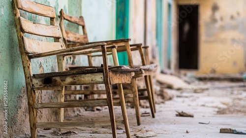 Abandoned wooden chairs in a dilapidated space surrounded by peeling paint and debris : Generative AI