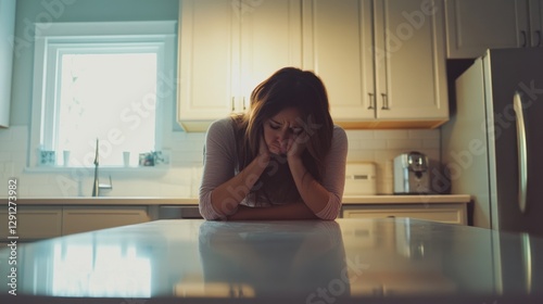 Abdominal pain causing a woman to bend over in pain at the kitchen counter. Featuring discomfort and concern