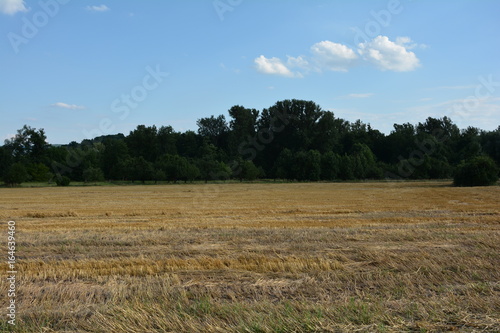 Abgeerntetes Getreidefeld mit Bäume im Hintergrund und mit blauem Himmel