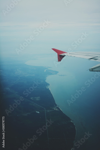 wing, view, plane, ocean, flying, coast, cloud, city, aeroplane