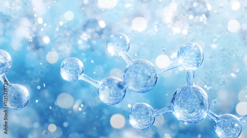 water, molecular, three-dimensional, render, abstract, blue, bokeh, background, science, chemistry, atom, structure, transparent, crystal, liquid, dripped, oxygen, hydrogen, bond, connection, sphere, orb, glow, shine, light, sparkle, refraction, macro, microscopic, closeup, illustration, graphic, design