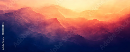 Abstract 3D Render of Misty Mountains at Sunset, Warm Color Palette, Digital Art Background