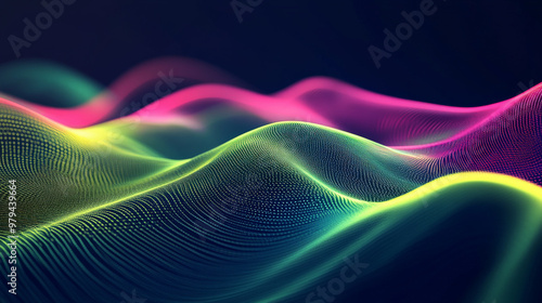 abstract, three-dimensional, wave, bold, neon, green, pink, rippling, dark, background, smooth, curve, intricate, light, reflections, vibrant, energetic, effect